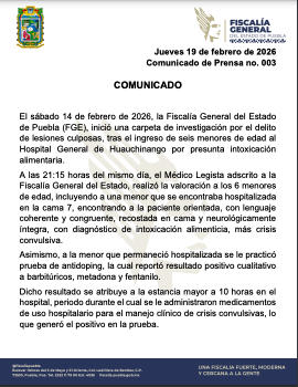 CIUDAD DE PUEBLA, PUE. (19 de febrero, 2026) – La Fiscalía General del Estado (FGE) emitió un reporte detallado sobre los análisis toxicológicos realizados tras la presunta intoxicación alimentaria de menores en la Sierra N...