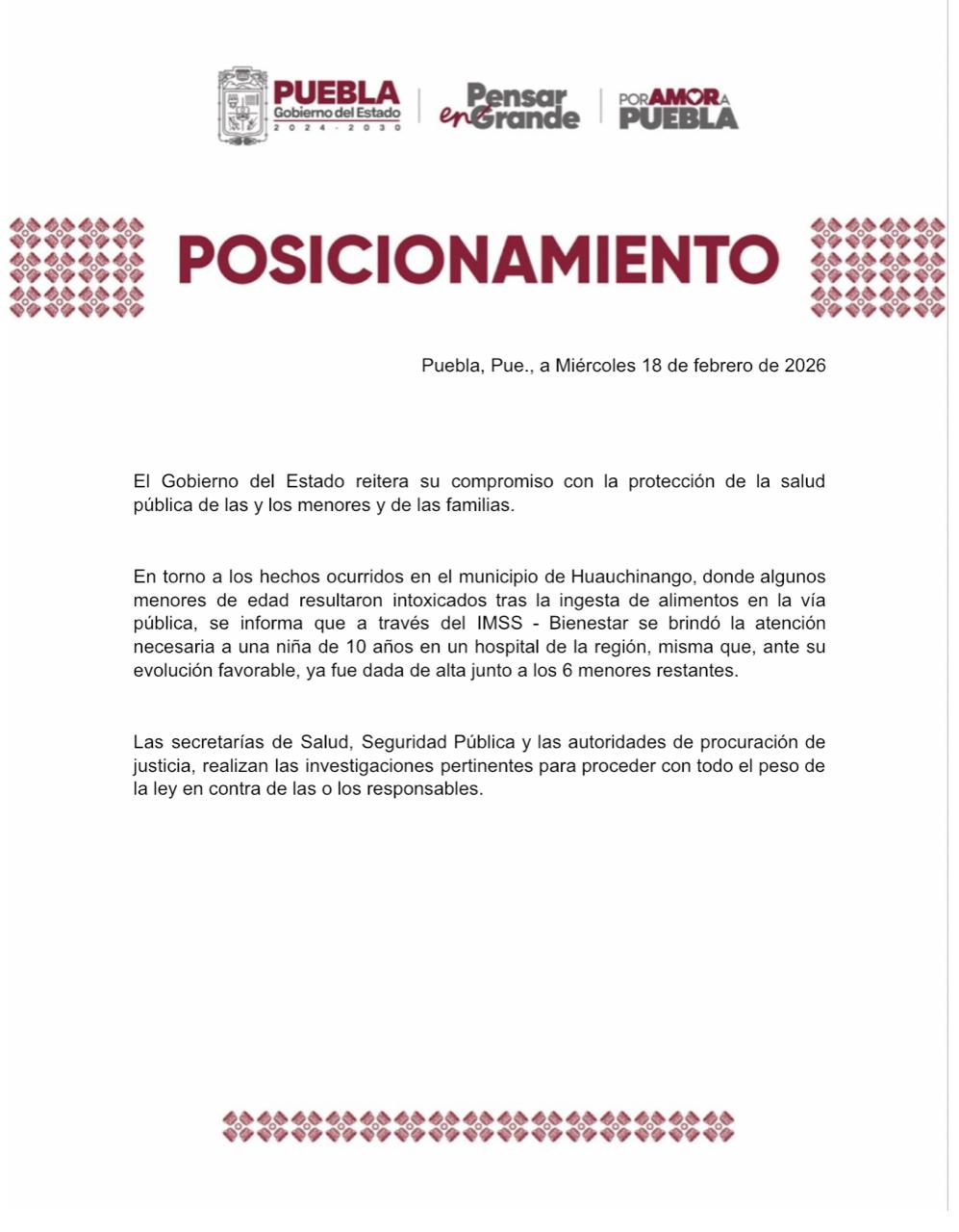 CIUDAD DE PUEBLA, PUE. (18 de febrero, 2026) – Tras el reporte de intoxicación alimentaria masiva en el municipio de Huauchinango, el Gobierno del Estado informó que la emergencia médica ha sido controlada. Las autoridades sa...