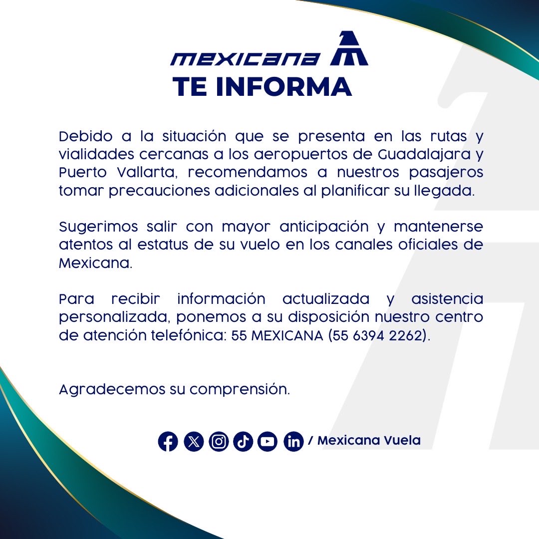 CIUDAD DE MÉXICO (22 de febrero, 2026) – La aerolínea Mexicana de Aviación emitió un aviso urgente para sus pasajeros debido a complicaciones en las vialidades que conectan con las terminales aéreas de Guadalajara y Puerto ...