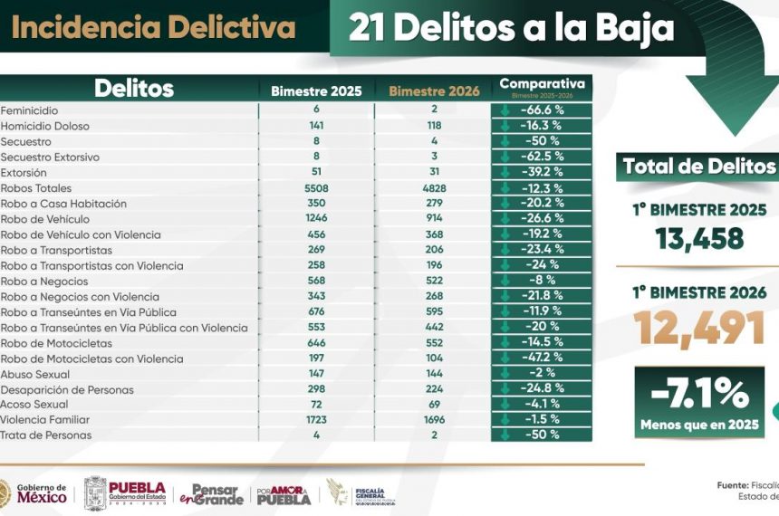 CIUDAD DE PUEBLA, Pue.- Durante el primer bimestre de 2026, la incidencia delictiva en Puebla disminuyó un siete por ciento en comparación con el mismo periodo de 2025, lo que representa 21 delitos con reducción, informó el go...