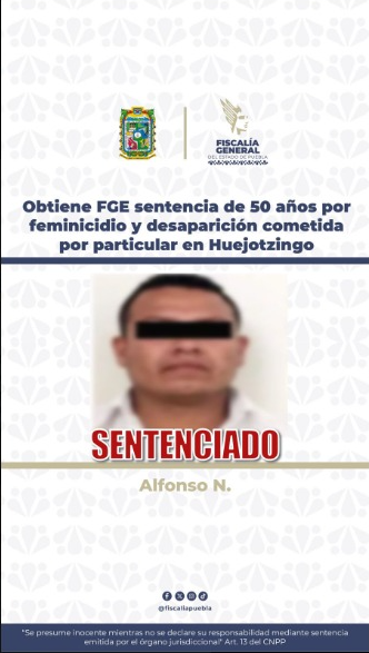 La Fiscalía General del Estado de Puebla obtuvo una sentencia condenatoria de 50 años de prisión contra Alfonso N., declarado responsable del delito de feminicidio por hechos ocurridos en el municipio de Huejotzingo. De acuerdo...