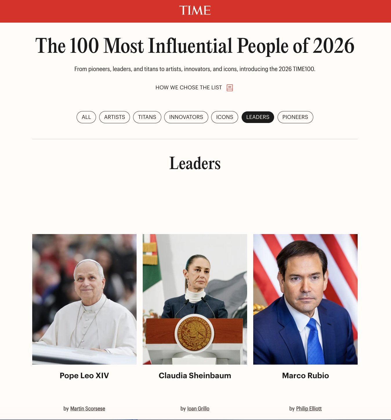 NUEVA YORK / CIUDAD DE MÉXICO (15 de abril, 2026) — En su edición anual de las 100 personas más influyentes del mundo, la revista TIME dedicó un espacio destacado a Claudia Sheinbaum Pardo, caracterizándola como una figura ...