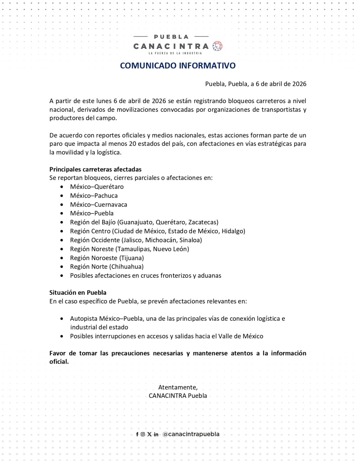 PUEBLA, PUE. (6 de abril, 2026) — Ante el inicio del paro nacional convocado por organizaciones de transportistas y productores agrícolas, la delegación poblana de la Cámara Nacional de la Industria de Transformación (CANACI...