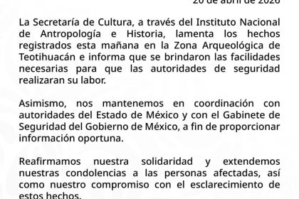 TEOTIHUACÁN, EDOMEX (20 de abril, 2026) — La Secretaría de Cultura, a través del Instituto Nacional de Antropología e Historia (INAH), emitió una tarjeta informativa en relación con los hechos...