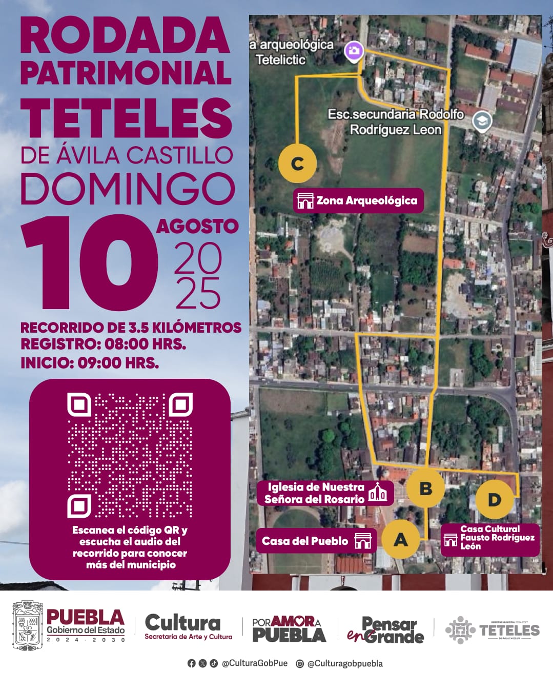 Puebla, Pue., 8 de agosto de 2025 — La Secretaría de Arte y Cultura del Estado de Puebla anunció la realización de la Rodada Patrimonial en Teteles de Ávila Castillo, un evento que busca fortalecer la identidad cultural, promover la actividad física y fomentar la convivencia entre habitantes y visitantes.