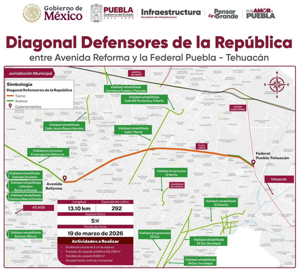 CIUDAD DE PUEBLA, PUE. (7 de abril, 2026) — Tras décadas de mantenimiento superficial y deterioro acumulado, el Gobierno del Estado, encabezado por el gobernador Alejandro Armenta Mier, avanza en la rehabilitación integral de la Diagonal Defensores de la República. Esta obra, considerada un eje estratégico de movilidad que conecta el sur con el norte de la ciudad, representa una intervención equivalente a la pavimentación de 292 calles, orientada a transformar la infraestructura urbana y elevar la calidad de vida en 50 colonias de la capital.