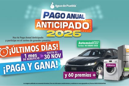 Puebla, Pue.– Agua de Puebla invita a todos los usuarios domésticos a aprovechar esta última semana del “Gran Fin del Ahorro” que concluye el próximo domingo 30 de noviembre y ofrece grandes ...