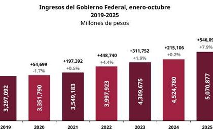 El Servicio de Administración Tributaria (SAT) informa que, de enero a octubre de 2025, los ingresos del Gobierno Federal, encabezado por la Presidenta Claudia Sheinbaum Pardo, alcanzaron 5 billones ...