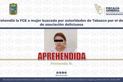 La Fiscalía General del Estado de Puebla ubicó y dio cumplimientoa una orden de aprehensión en contra de Fernanda Monserrat N.,quien era buscada por autoridades del estado de Tabasco, por suprobabl...