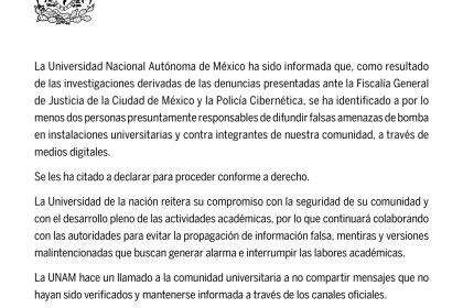 La Universidad Nacional Autónoma de México (UNAM) ha sido informada que, como resultado de las investigaciones derivadas de las denuncias presentadas ante la Fiscalía General de Justicia de la Ciud...