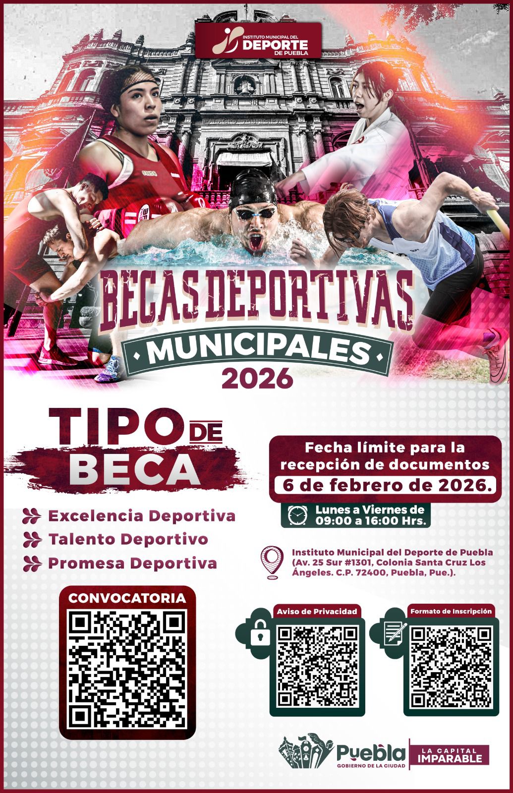 Puebla, Pue., 06 de enero de 2026.– Con el propósito de reforzar el esfuerzo deportivo y disciplina, el Gobierno de la Ciudad, encabezado por el alcalde Pepe Chedraui Budib, a través del Instituto Municipal del Deporte de Puebla (IMDP), dirigido por Ricardo Zayas Gallardo, anunció la convocatoria para las Becas Deportivas Municipales 2026, un programa que busca impulsar el talento poblano y fortalecer el deporte en la capital.