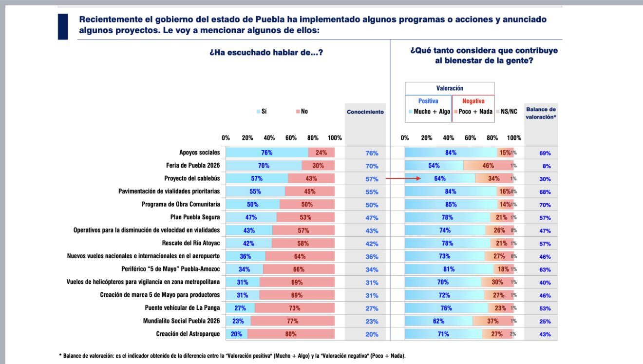 No obstante, el estudio subraya que, a pesar de las críticas en línea, el Cablebús se posiciona como la tercera política pública con mayor reconocimiento del gobierno de Alejandro Armenta, solo detrás de los «apoyos sociales» y la Feria de Puebla 2026. Esto sugiere que, a pesar del ruido en ciertos foros, el proyecto de movilidad ha logrado conectar con la percepción mayoritaria de la ciudadanía.