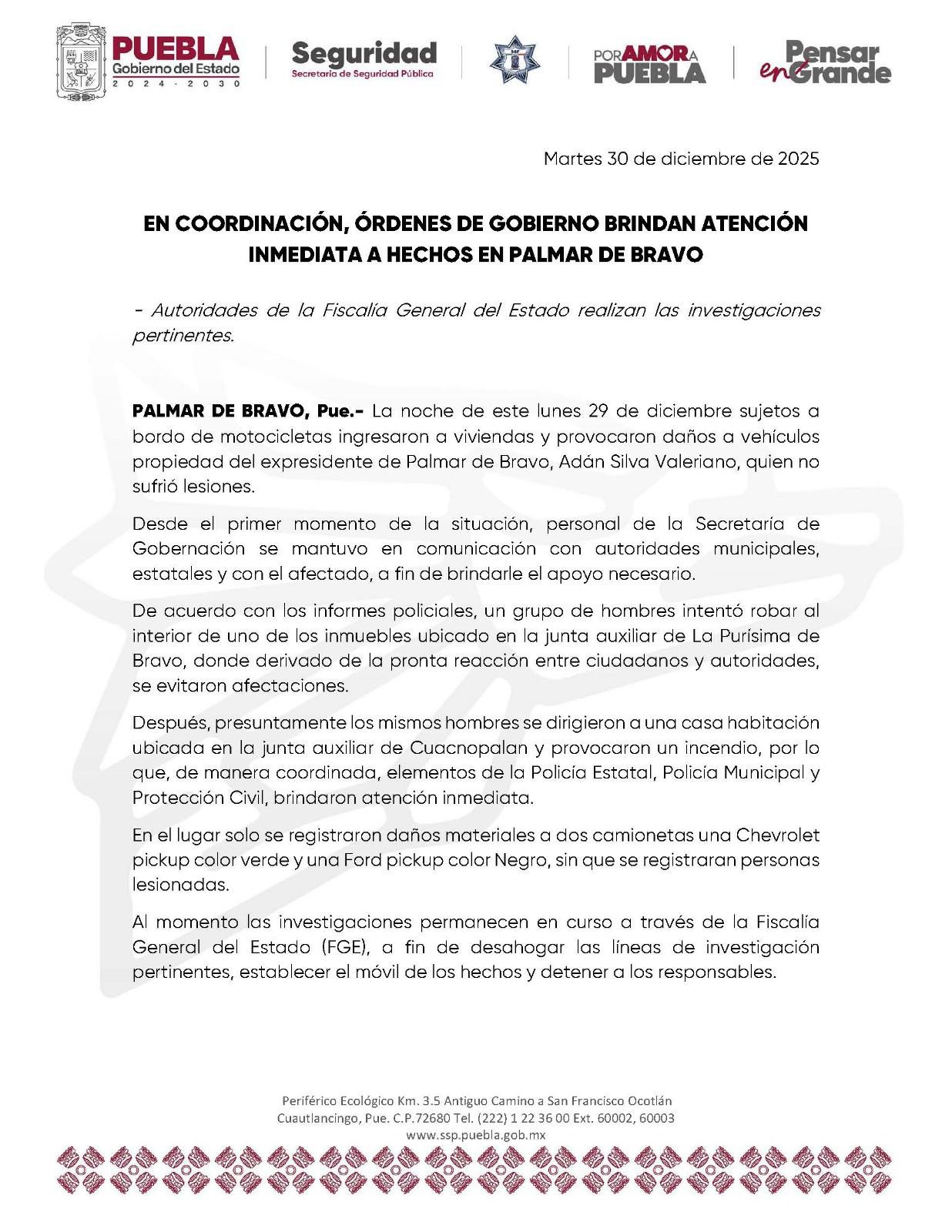 Desde el primer momento de la situación, personal de la Secretaría de Gobernación se mantuvo en comunicación con autoridades municipales, estatales y con el afectado, a fin de brindarle el apoyo necesario.