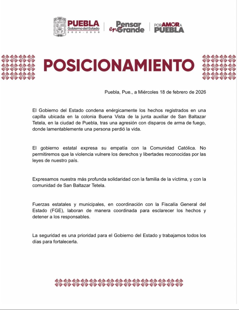 CIUDAD DE PUEBLA, PUE. (19 de febrero, 2026) – A través de un pronunciamiento oficial, el Gobierno del Estado condenó de manera enérgica el ataque armado ocurrido en la capilla de la colonia Buena Vista, perteneciente a la junta auxiliar de San Baltazar Tetela, donde un joven de 20 años perdió la vida mientras realizaba labores de mantenimiento.