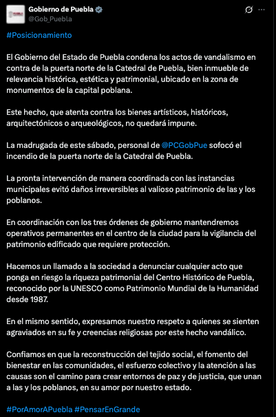 • Respeto a la fe: La administración estatal expresó su solidaridad con la comunidad católica y con todas las personas que se sienten agraviadas en sus creencias por este acto vandálico.