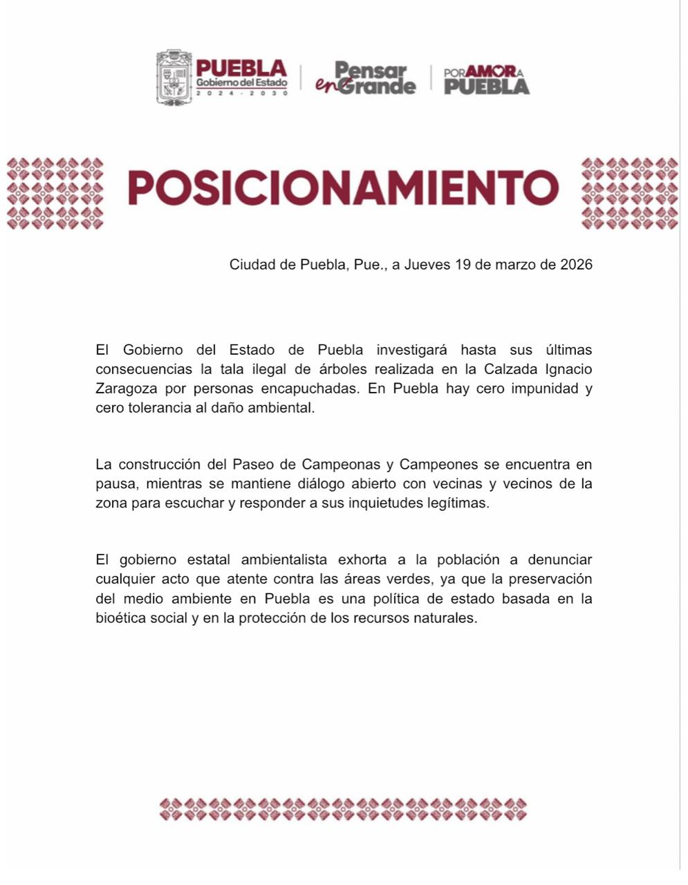 CIUDAD DE PUEBLA, PUE. (19 de marzo, 2026) — Ante los recientes actos de vandalismo ambiental registrados en la Calzada Ignacio Zaragoza, el Gobierno del Estado de Puebla emitió un pronunciamiento firme para garantizar que no habrá impunidad contra quienes resulten responsables de la tala ilegal de ejemplares en la zona. La administración estatal reafirmó su compromiso con la bioética social y la protección irrestricta de los recursos naturales de la entidad.