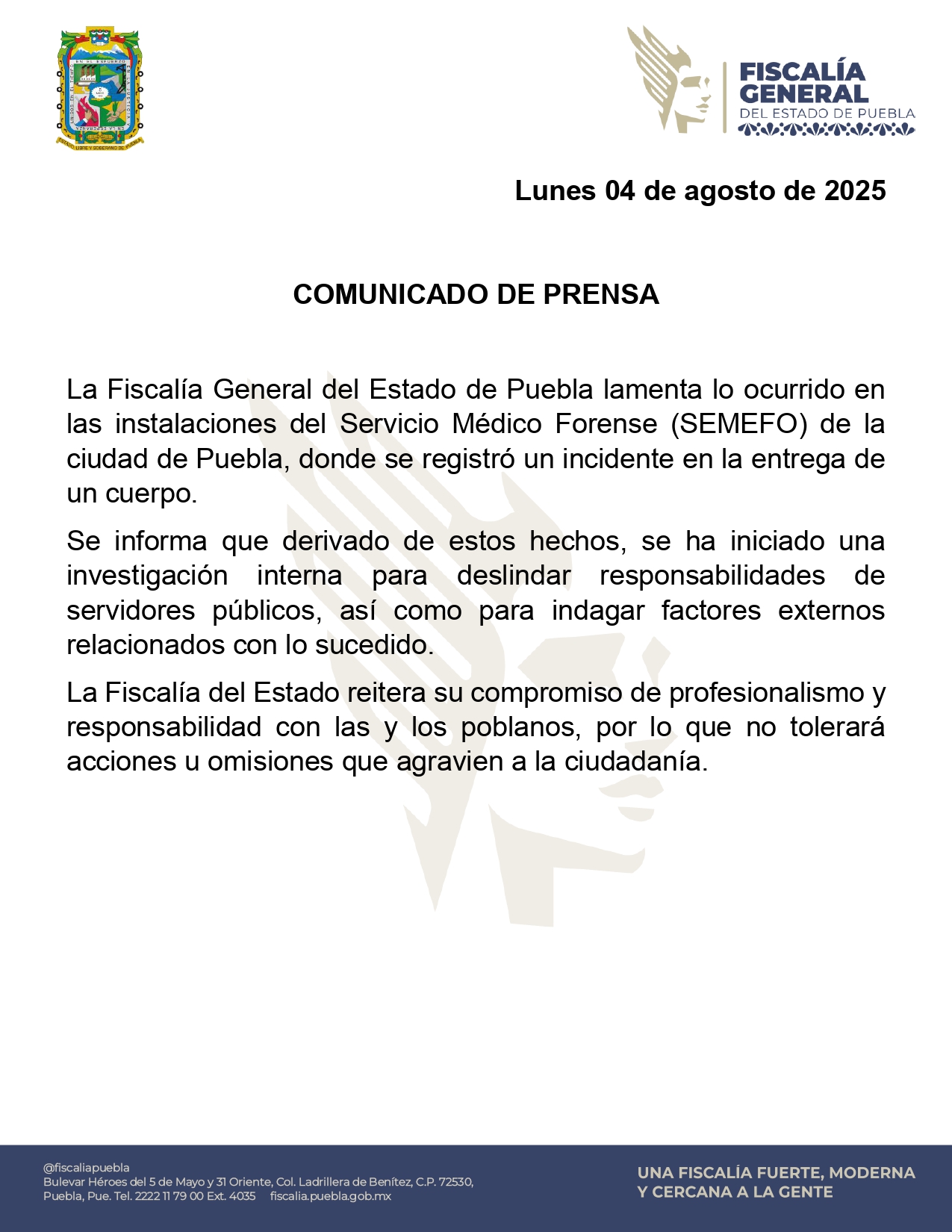 Home / Estado / La FGE lamenta lo sucedido en el SEMEFO e inicia investigación para deslindar responsabilidadesEstadoLa FGE lamenta lo sucedido en el SEMEFO e inicia investigación para deslindar responsabilidadesPor Redaccion Editorial No hay comentariosagosto 5, 2025 11:25 amCompartir notaEtiquetado:Alejandro ArmentaEstado de PueblaFGEIncidenteInvestigacionSEMEFOPrevious ArticleConfianza y protección ante el Popocatépetl: Gobierno de Puebla refuerza rutas de evacuaciónNext ArticleCampaña #SíaLaCiclovía respalda proyecto del alcalde Chedraui en medio de protestas en Puebla Related Posts Armenta destaca la importancia de la colaboración entre poderes ... septiembre 30, 2025 Impulso de la industria del calzado en Puebla: un sueño que gene ... septiembre 30, 2025 septiembre 30, 2025