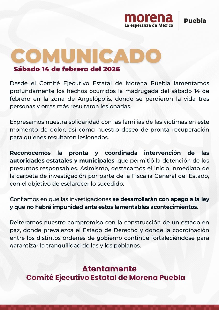 CIUDAD DE PUEBLA, PUE. (15 de febrero, 2026) – A través de un boletín de prensa, la dirigencia estatal de Morena expresó su postura sobre el ataque directo que cobró la vida de tres personas a las afueras de un centro nocturno.