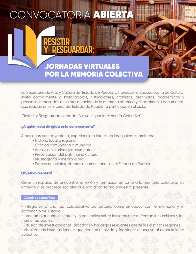Puebla, Pue., 14 de julio de 2025 — La Secretaría de Arte y Cultura del Gobierno de Puebla, encabezada por Alejandro Armenta, lanzó una convocatoria para participar en el proyecto “Resistir y resguardar: Jornadas virtuales por la memoria colectiva”. Este ciclo de cuatro conferencias busca crear una red colaborativa de personas interesadas en temas relacionados con la historia, el patrimonio cultural, la memoria y los procesos sociales en la región.