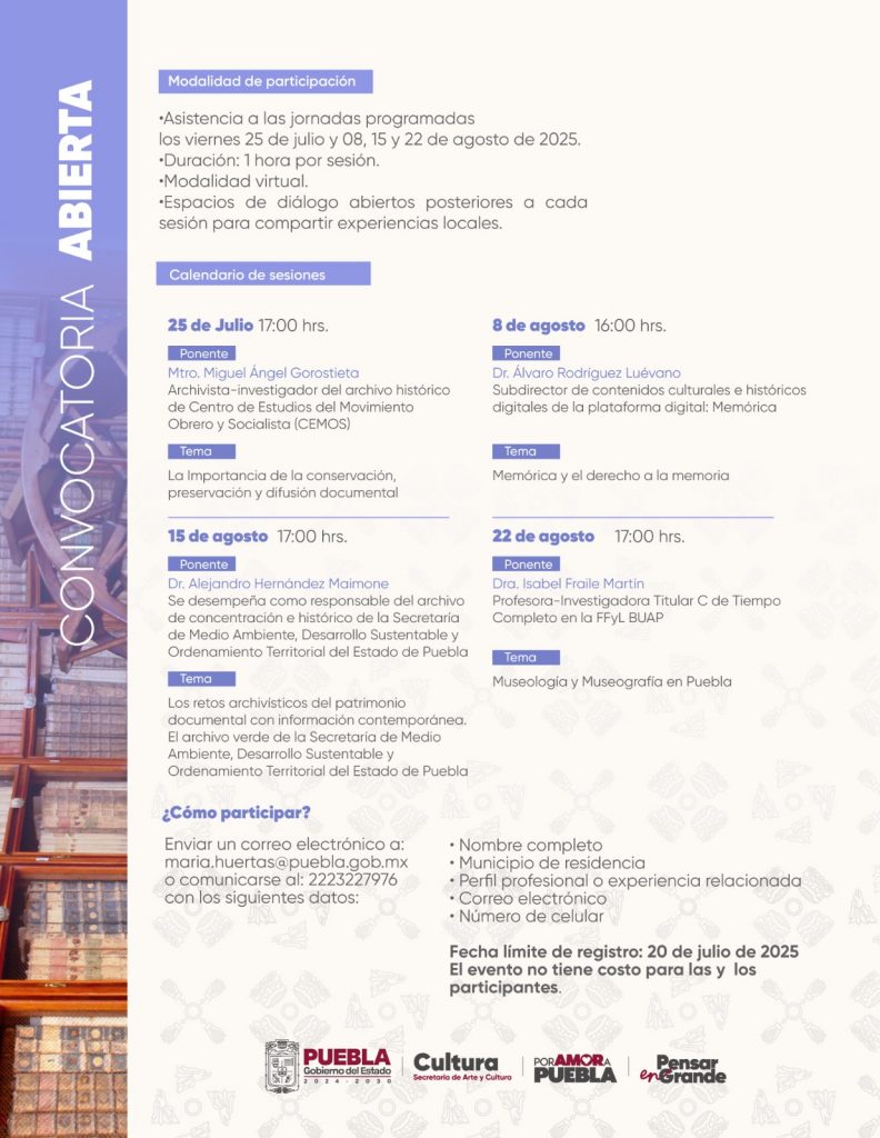 La iniciativa está dirigida a actores sociales con experiencia, trayectoria o interés en áreas como historia local o regional, crónica comunitaria, archivos históricos y documentales, museografía, memoria oral y movimientos sociales en Puebla. Las sesiones serán gratuitas y se realizarán los viernes 25 de julio, 8, 15 y 22 de agosto.