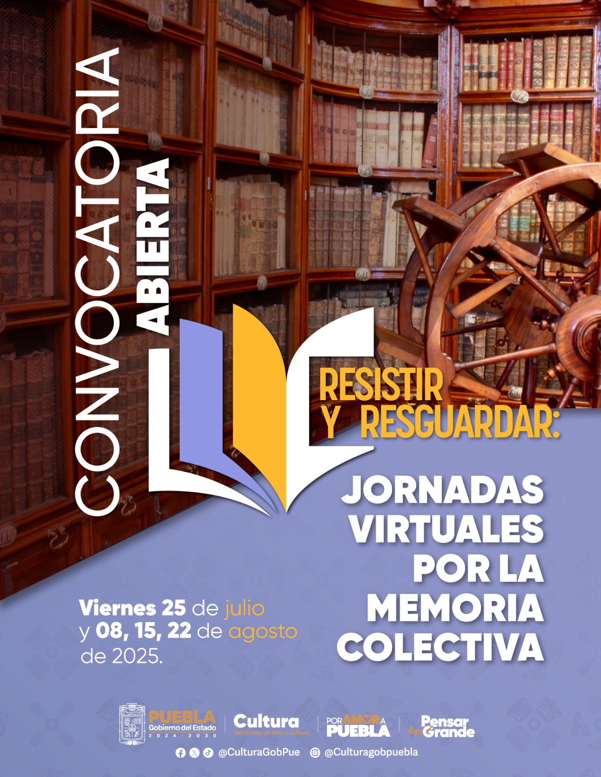 Puebla, Pue., 14 de julio de 2025 — La Secretaría de Arte y Cultura del Gobierno de Puebla, encabezada por Alejandro Armenta, lanzó una convocatoria para participar en el proyecto “Resistir y resguardar: Jornadas virtuales por la memoria colectiva”. Este ciclo de cuatro conferencias busca crear una red colaborativa de personas interesadas en temas relacionados con la historia, el patrimonio cultural, la memoria y los procesos sociales en la región.