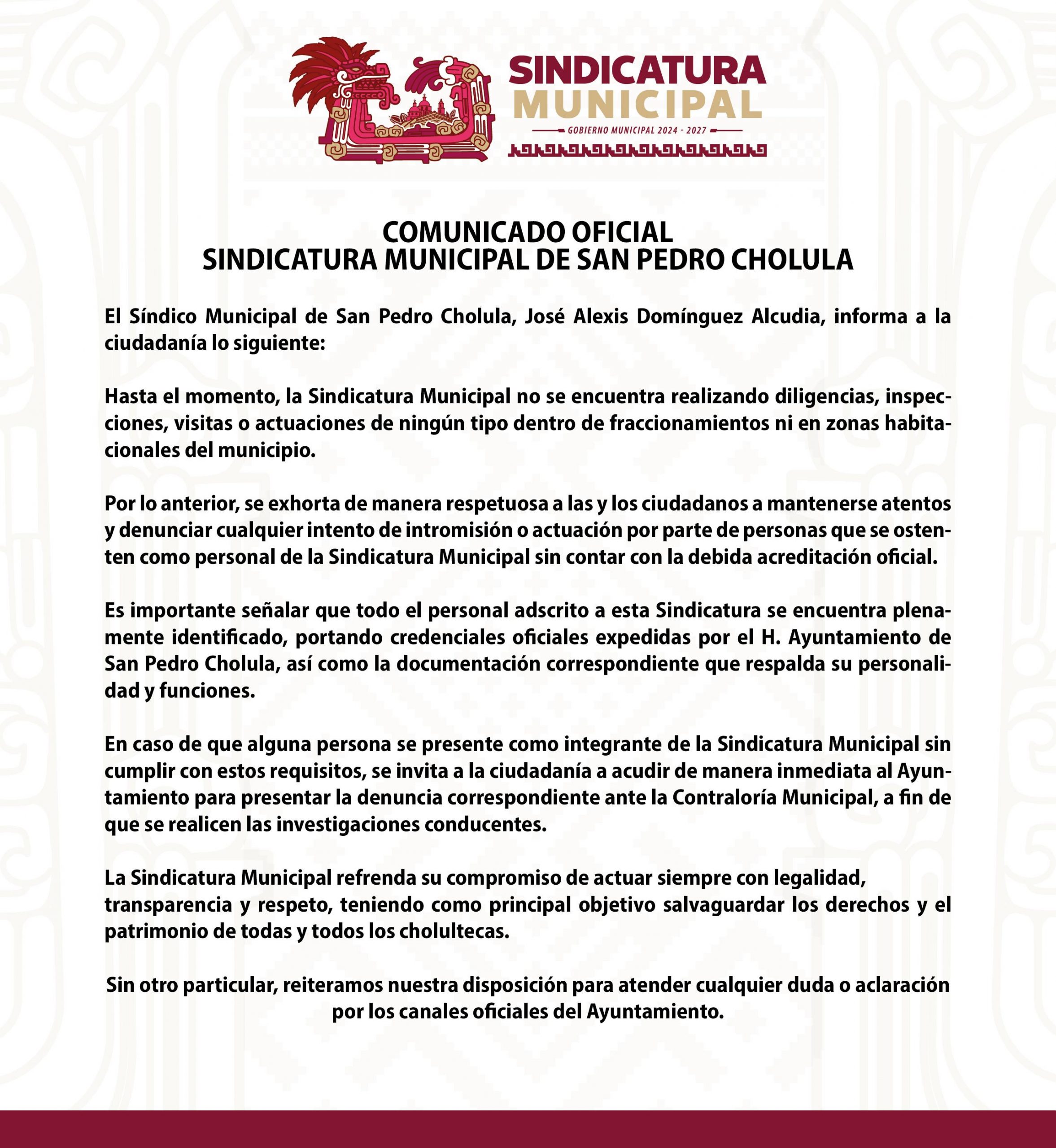 SAN PEDRO CHOLULA, PUE. – Con el objetivo de proteger el patrimonio y la tranquilidad de las familias, el Síndico Municipal, José Alexis Domínguez Alcudia, emitió un comunicado oficial para deslindar a la dependencia de cualquier actividad sospechosa reportada recientemente en fraccionamientos y zonas habitacionales del municipio.