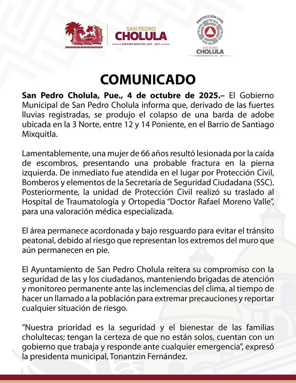 San Pedro Cholula, Pue. — El Gobierno Municipal de San Pedro Cholula informa que, derivado de las fuertes lluvias registradas, se produjo el colapso de una barda de adobe ubicada en la 3 Norte, entre 12 y 14 Poniente, en el Barrio de Santiago Mixquitla.
