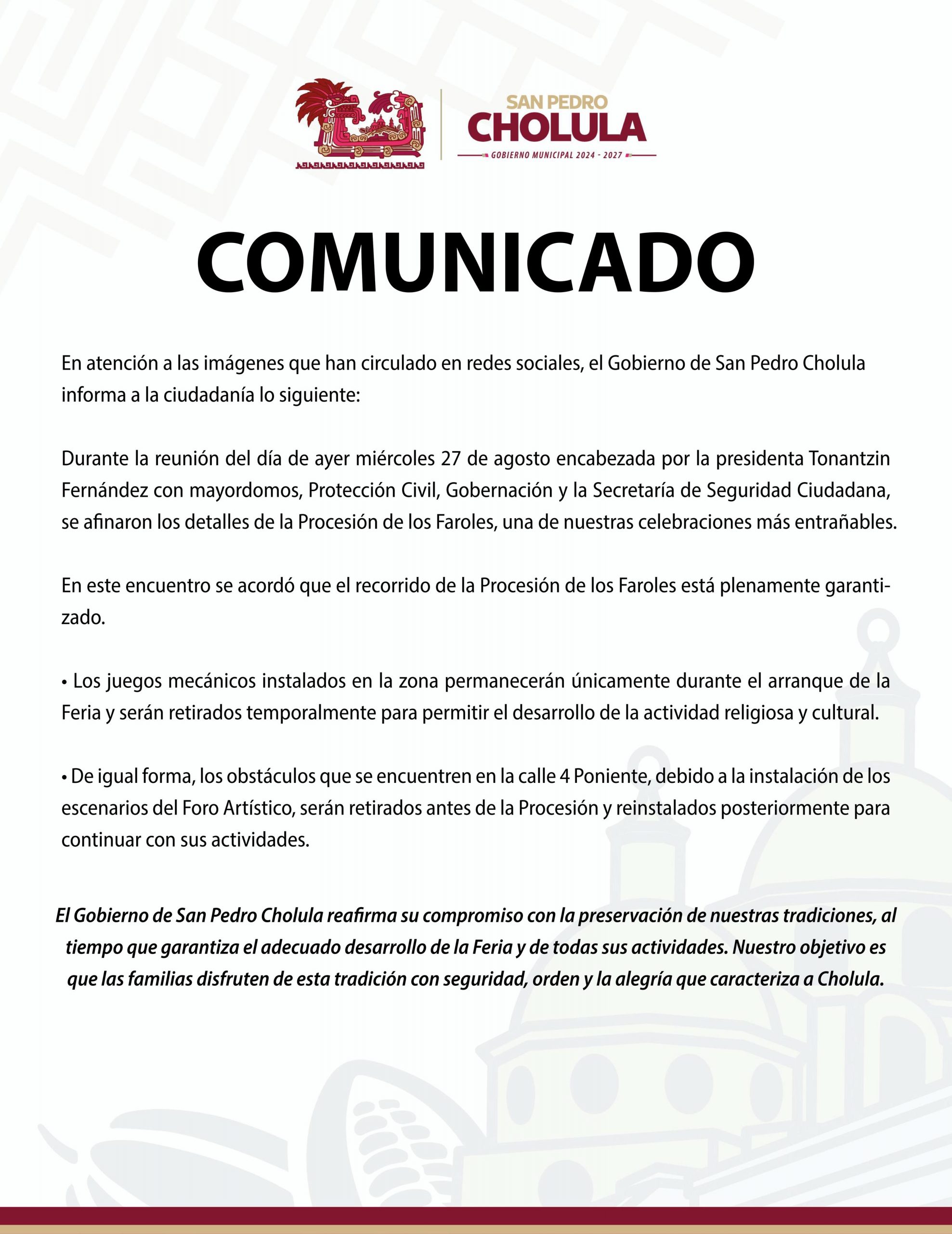 El Gobierno de San Pedro Cholula reafirma su compromiso con la preservación de nuestras tradiciones, al tiempo que garantiza el adecuado desarrollo de la Feria y de todas sus actividades. Nuestro objetivo es que las familias disfruten de esta tradición con seguridad, orden y la alegría que caracteriza a Cholula.