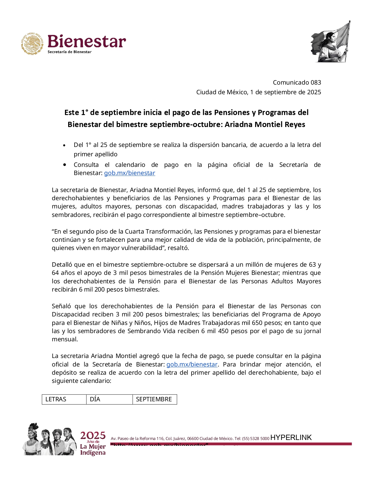 Ciudad de México — La secretaria de Bienestar, Ariadna Montiel Reyes, informó que, del 1 al 25 de septiembre, los derechohabientes y beneficiarios de las Pensiones y Programas para el Bienestar de las mujeres, adultos mayores, personas con discapacidad, madres trabajadoras y las y los sembradores, recibirán el pago correspondiente al bimestre septiembre–octubre.
