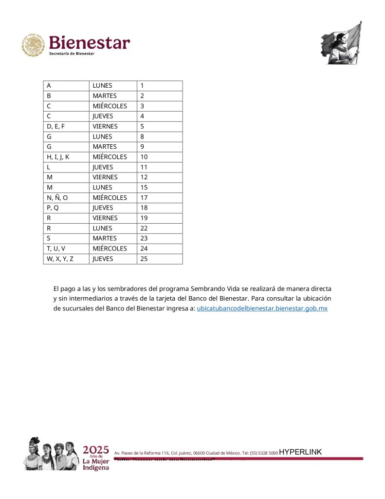 La secretaria Ariadna Montiel agregó que la fecha de pago, se puede consultar en la página oficial de la Secretaría de Bienestar: gob.mx/bienestar. Para brindar mejor atención, el depósito se realiza de acuerdo con la letra del primer apellido del derechohabiente, bajo el siguiente calendario: