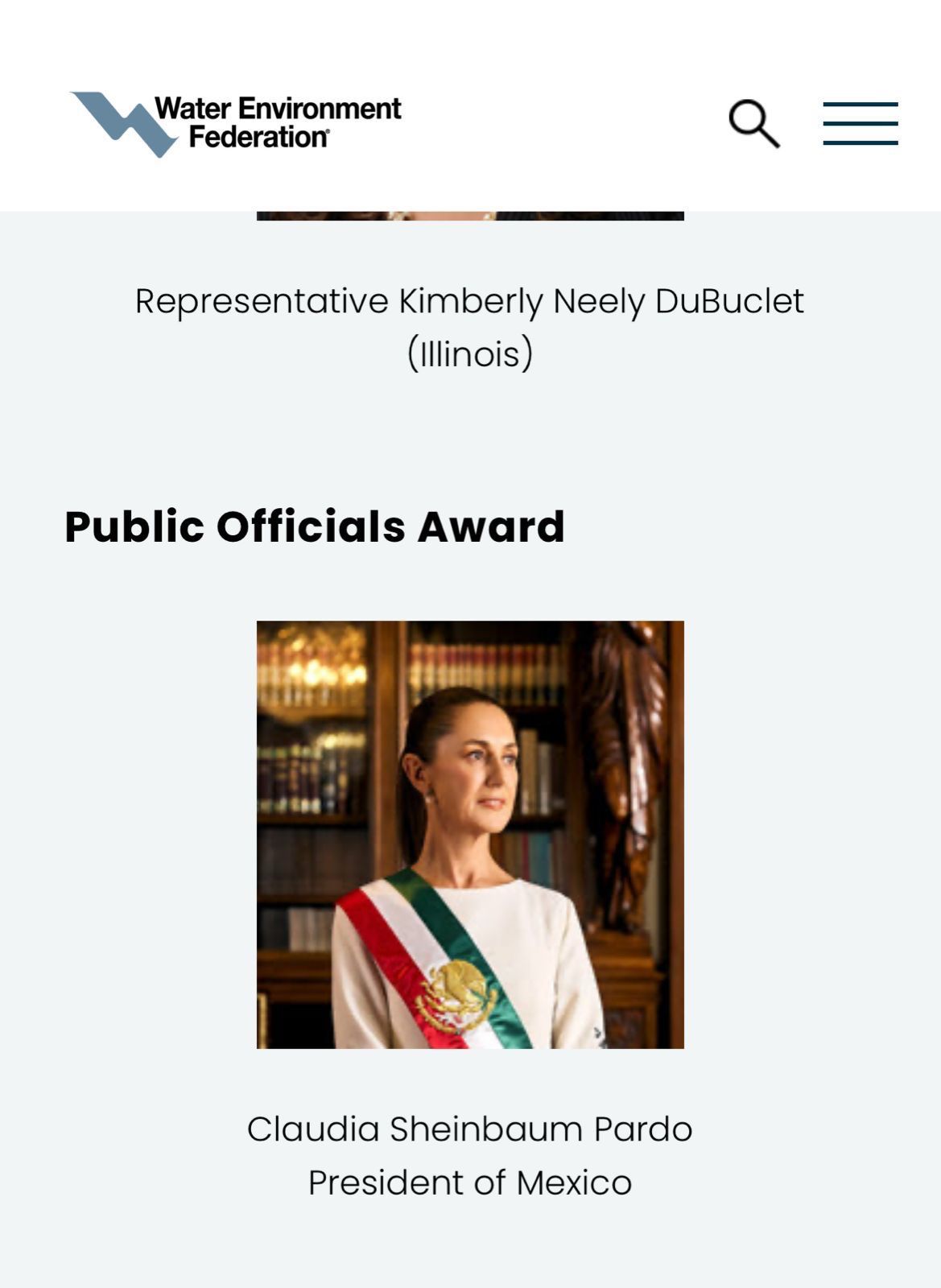 Water Environment Federation entrega el Premio a los Funcionarios Públicos a la Presidenta de México, Dra. Claudia Sheinbaum Pardo
