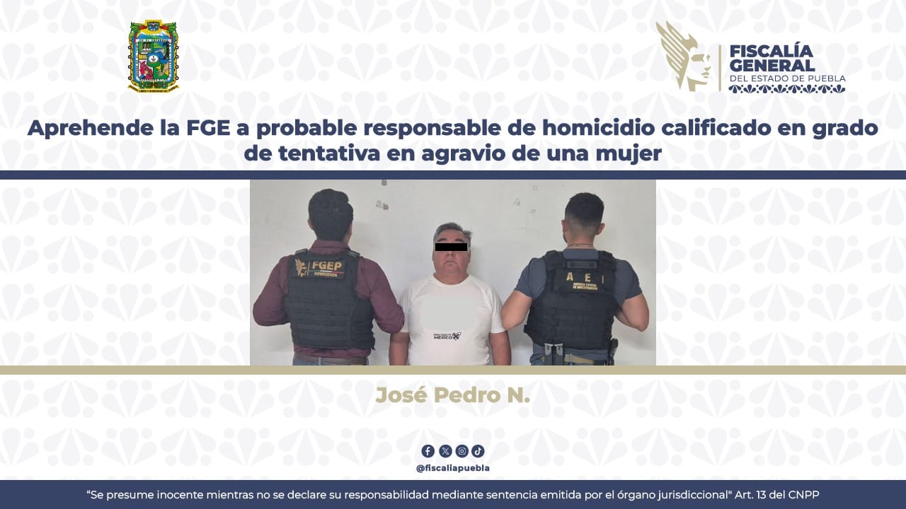 Puebla, Pue., 22 de agosto de 2025 — En seguimiento a una investigación por el delito de homicidio calificado en grado de tentativa en agravio de una mujer, la Fiscalía General del Estado logró la aprehensión de José Pedro N., alias “El Peri”, de 55 años de edad, como probable responsable del hecho.