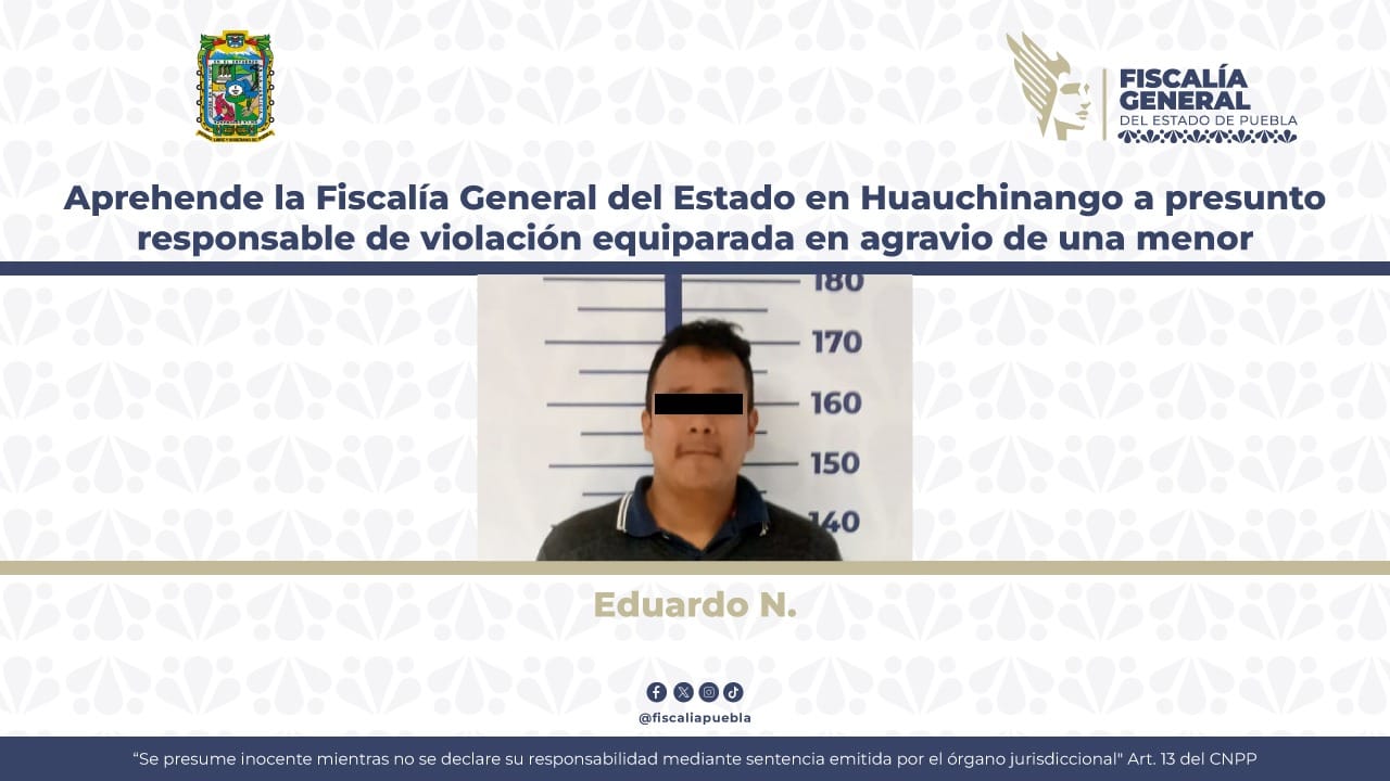 La Fiscalía General del Estado informa que fue aprehendido en el municipio de Huauchinango, Eduardo N., de 32 años de edad, originario de Pahuatlán, como presunto responsable del delito de violación equiparada en agravio de una menor de edad.
