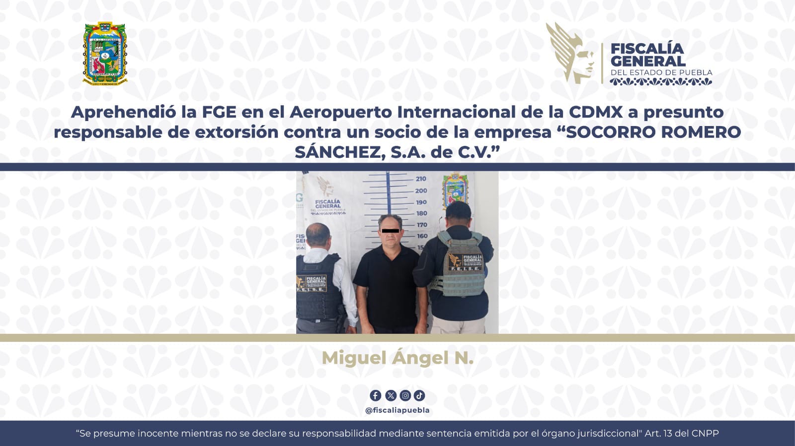 La Fiscalía General del Estado de Puebla con apoyo de la Fiscalía General de Justicia de la Ciudad de México, cumplió una orden de aprehensión en contra de Miguel Ángel N., probable responsable del delito de extorsión contra un socio de la empresa “SOCORRO ROMERO SÁNCHEZ, S.A. de C.V.”.