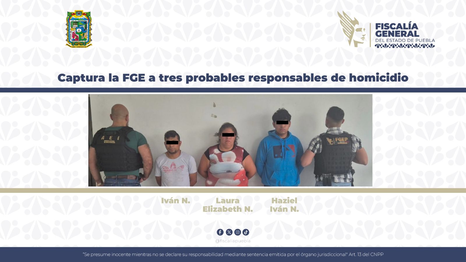 Puebla, Pue., 18 de agosto de 2025 — La Fiscalía General del Estado de Puebla detuvo mediante orden de aprehensión a Laura Elizabeth N., de 35 años, Iván N., de 40 años y Haziel Iván N., de 18 años, presuntamente relacionados con el homicidio de un hombre en inmediaciones de la colonia Galaxia Bosques de Manzanilla de la ciudad de Puebla.