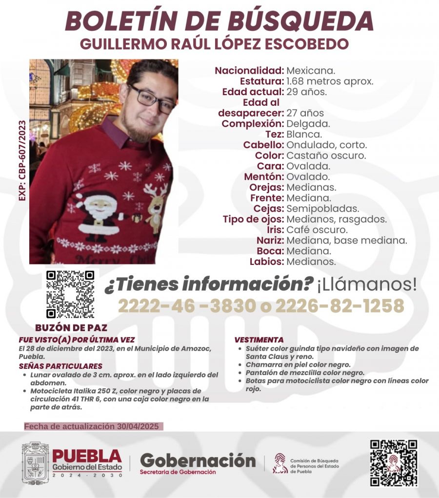Puebla, Pue.- Ante el reporte por la desaparición y no localización de Guillermo Raúl López Escobedo, de 27 años, en diciembre del 2023 el Gobierno del Estado a través de la Comisión de Búsqueda de Personas, mantiene acciones conjuntas entre autoridades estatales y familiares para su localización.