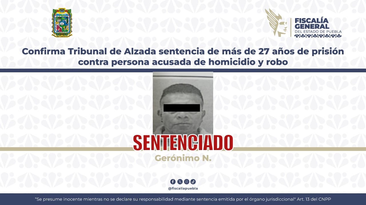 El Tribunal de Alzada confirmó con base en las pruebas que presentó la Fiscalía General del Estado, una sentencia de más de 27 años de prisión contra Gerónimo N., acusado de homicidio calificado y robo agravado, ocurrido en la ciudad de Puebla.