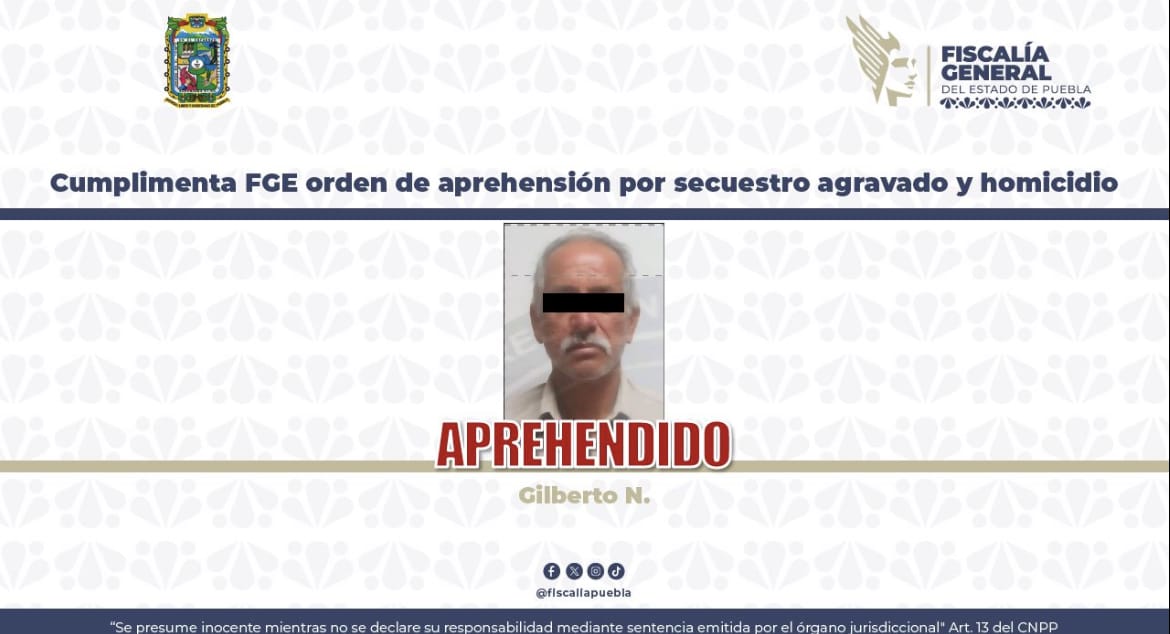 CIUDAD DE PUEBLA, PUE. (24 de abril, 2026) — Como parte del seguimiento a casos de alto impacto y la lucha contra la impunidad, la Fiscalía General del Estado de Puebla (FGE) cumplimentó una orden de aprehensión en contra de Gilberto N., señalado por su probable responsabilidad en los delitos de secuestro agravado y homicidio calificado. Los hechos que se le imputan ocurrieron en el año 2009 en el municipio de Atzizintla.