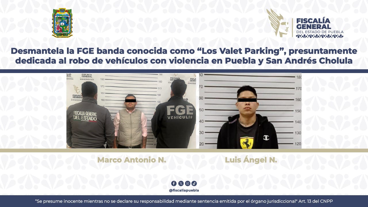 La Fiscalía General del Estado de Puebla logró desmantelar a la banda delictiva conocida como “Los Valet Parking”, presuntamente dedicada al robo de vehículos con violencia en los municipios de Puebla y San Andrés Cholula. A través de labores de inteligencia, campo y gabinete, se logró la detención de sus presuntos integrantes, Marco Antonio N. y Luis Ángel N., quienes ya fueron puestos a disposición de la autoridad judicial.