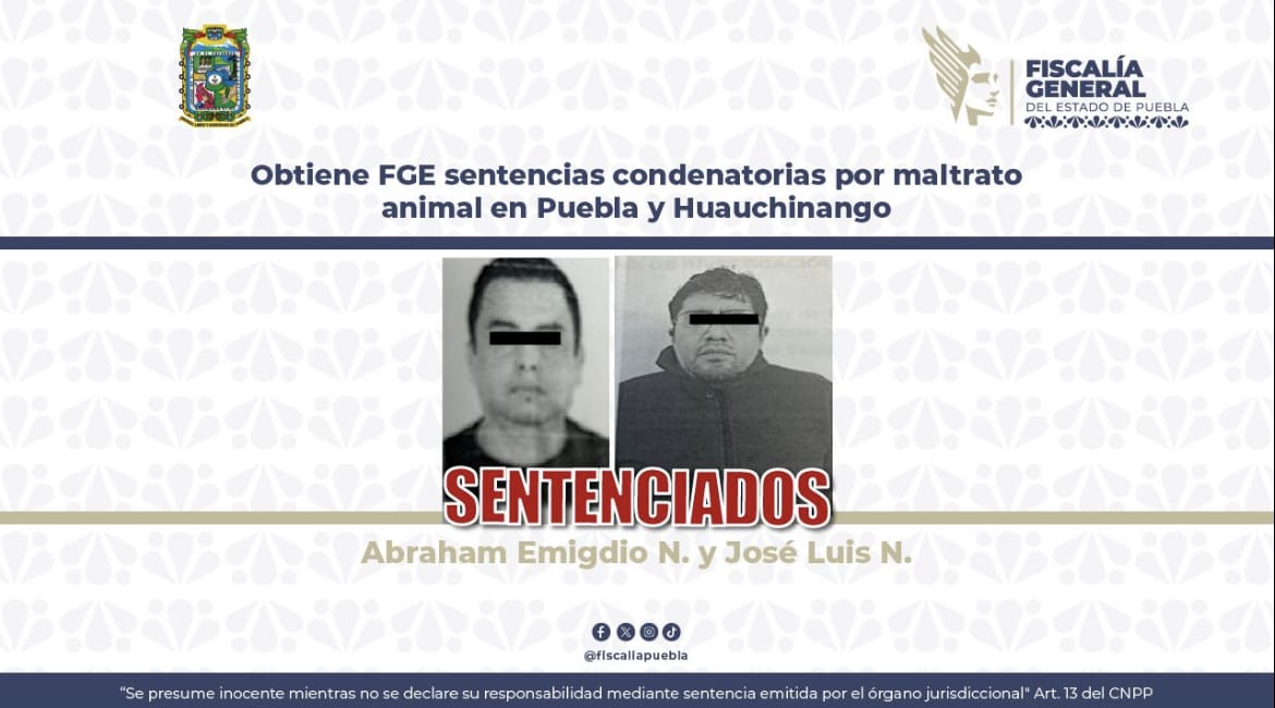 CIUDAD DE PUEBLA, PUE. (13 de abril, 2026) — Como resultado del seguimiento jurídico a las denuncias por maltrato animal, la Fiscalía General del Estado de Puebla (FGE) logró sentencias condenatorias contra dos individuos responsables de actos de crueldad que derivaron en la muerte de ejemplares domésticos. Estas resoluciones, obtenidas mediante procedimientos abreviados, refuerzan el precedente legal en la entidad para la sanción de delitos que atentan contra seres sintientes.