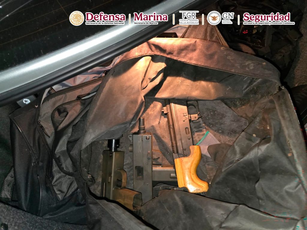 Al efectuar una inspección de seguridad, hallaron una pistola en el asiento del pasajero y en la cajuela cuatro maletas que contenían las armas de fuego.