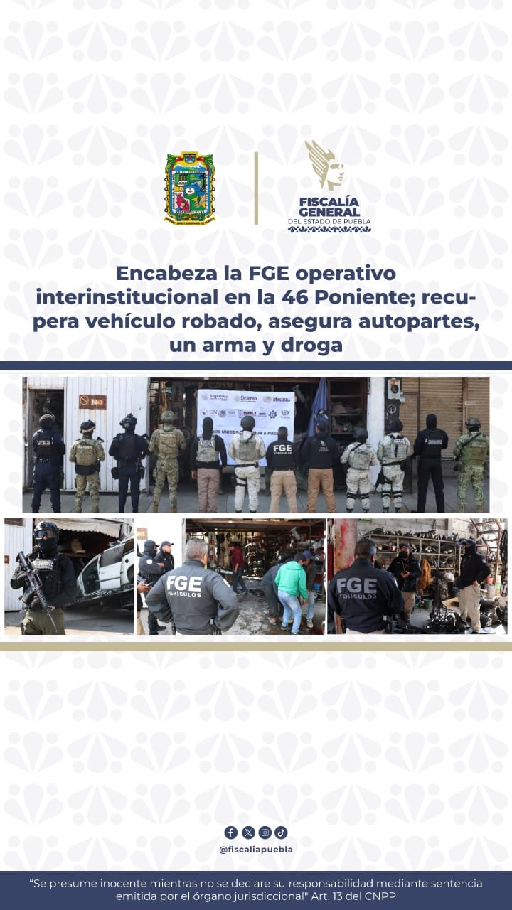 Home / Seguridad / Encabeza la FGE operativo interinstitucional en la 46Poniente; recupera vehículo robado, asegura autopartes, unarma y droga