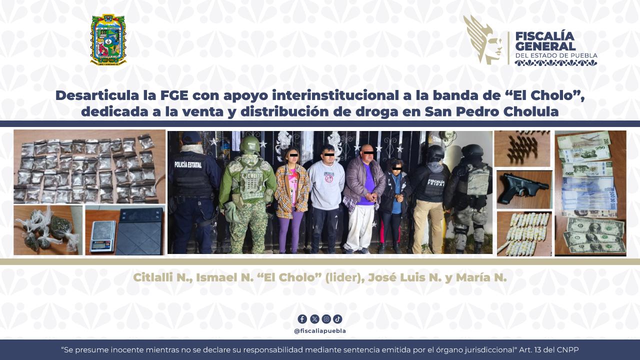 San Pedro Cholula, Puebla. — La Fiscalía General del Estado (FGE), con apoyo interinstitucional, desarticuló la banda conocida como “El Cholo”, dedicada a la venta y distribución de droga en el municipio. La acción derivó en la detención del presunto líder y tres integrantes más, además del aseguramiento de droga y un inmueble utilizado como punto de operación.