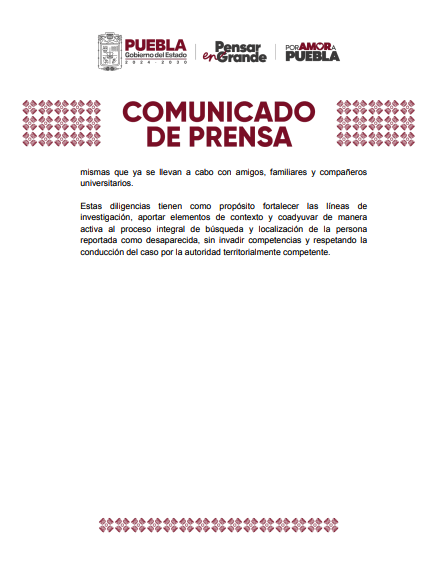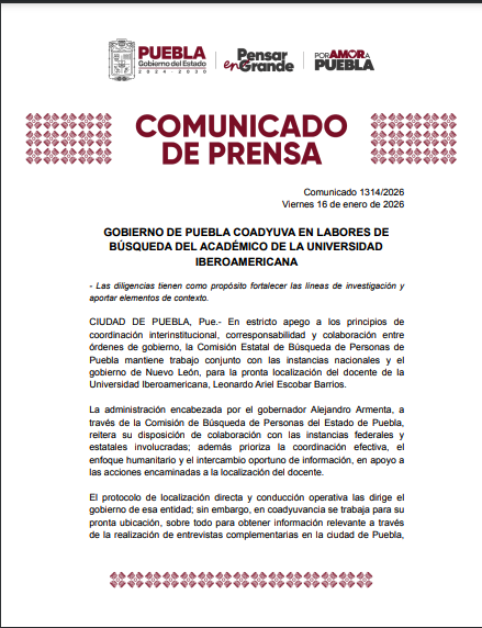 La administración encabezada por el gobernador Alejandro Armenta, a través de la Comisión de Búsqueda de Personas del Estado de Puebla, reitera su disposición de colaboración con las instancias federales y estatales involucradas; además prioriza la coordinación efectiva, el enfoque humanitario y el intercambio oportuno de información, en apoyo a las acciones encaminadas a la localización del docente.