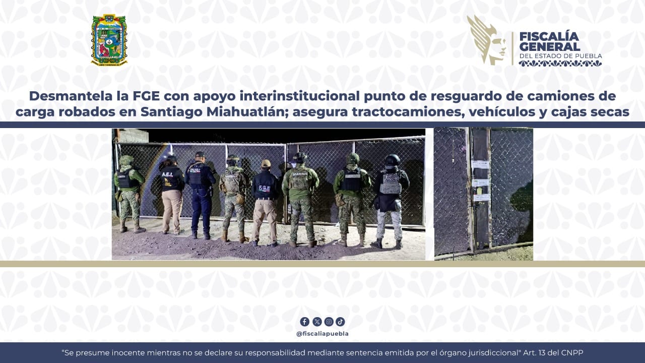 SANTIAGO MIAHUATLÁN, PUE. – En una operación estratégica de inteligencia y despliegue físico, la Fiscalía General del Estado (FGE), en colaboración con la DEFENSA, SEMAR, Guardia Nacional y la SSPE, desarticuló un importante punto de almacenamiento de vehículos robados ubicado en la localidad de Villa Alegría.