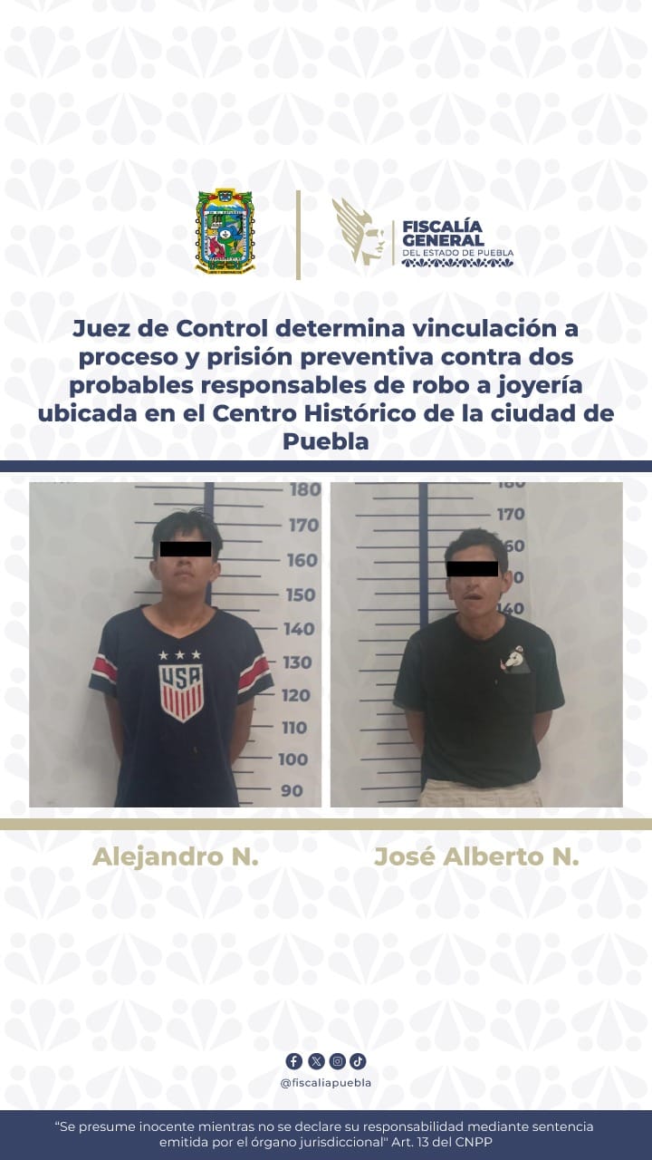 El Juez de Control determinó la vinculación a proceso y otorgó prisión preventiva oficiosa contra José Alberto N. y Alejandro N., de 35 y 18 años de edad respectivamente, esto con base en los datos de prueba y argumentos aportados por la Fiscalía General del Estado, como probables responsables en el delito de robo agravado en agravio del establecimiento denominado Joyería Havilá, ubicado en la colonia Centro de la ciudad de Puebla.