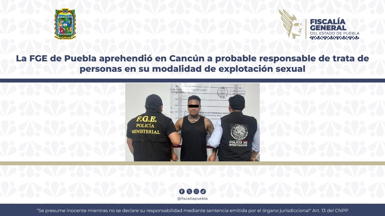 La Fiscalía General del Estado de Puebla, en coordinación con autoridades de Quintana Roo, cumplimentó una orden de aprehensión en el municipio de Cancún, en contra de Omar N., de 33 años de edad, por su probable responsabilidad en el delito de trata de personas en su modalidad de explotación sexual a través de la prostitución ajena, en agravio de su esposa.
