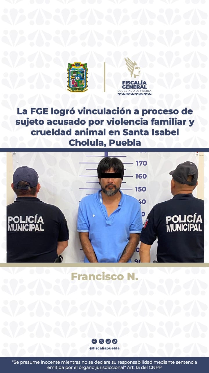 Puebla, Pue., 10 de agosto de 2025 — La Fiscalía General del Estado logró mediante la aportación de diversos datos de prueba, la vinculación a proceso de Francisco N., de 41 años de edad, acusado de violencia familiar y de delitos contra los animales mediante actos de crueldad en el municipio Santa Isabel Cholula, Puebla.