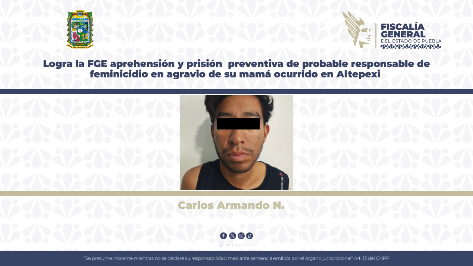 Puebla, Pue. — La Fiscalía General del Estado logró la aprehensión de Carlos Armando N., quien además se encuentra con prisión preventiva oficiosa como medida cautelar por su probable responsabilidad en el delito de feminicidio en agravio de su mamá.