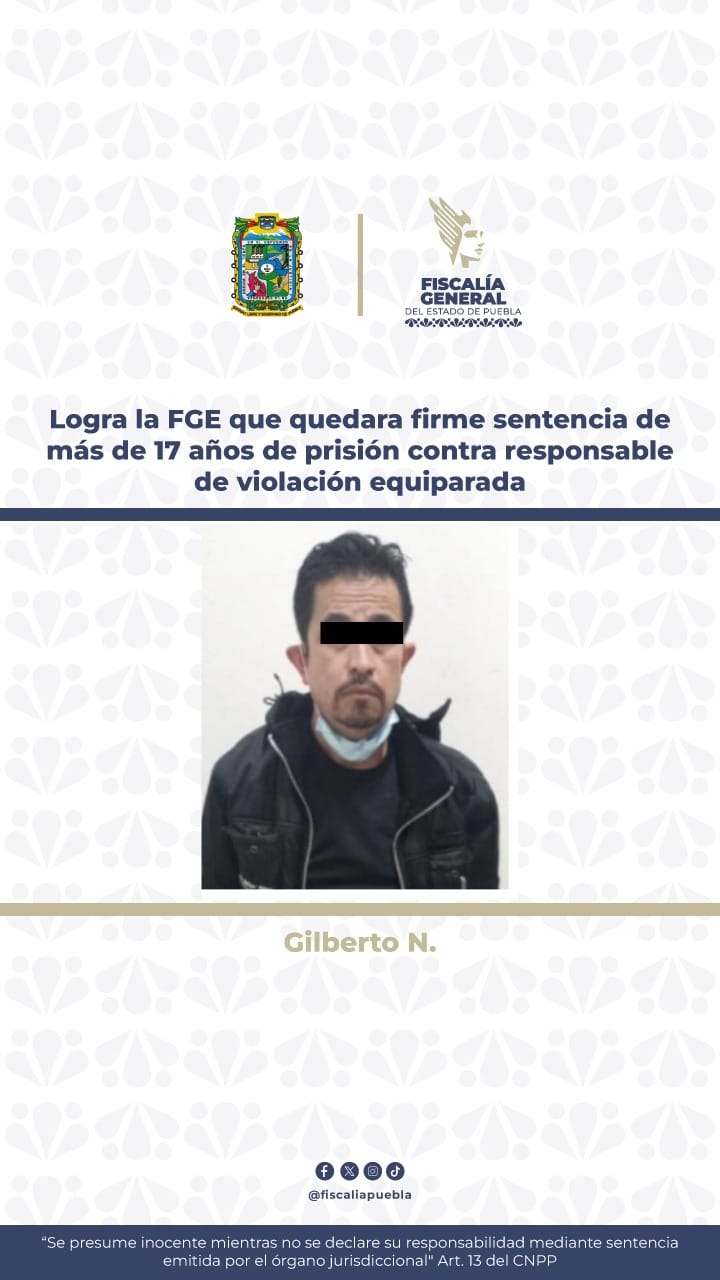 La Fiscalía General del Estado informa que, derivado de los elementos de prueba presentados durante el proceso, el Tribunal de Alzada confirmó la sentencia de 17 años, 6 meses de prisión dictada en contra de Gilberto N., declarado penalmente responsable del delito de violación equiparada, en agravio de su sobrina menor de edad.
